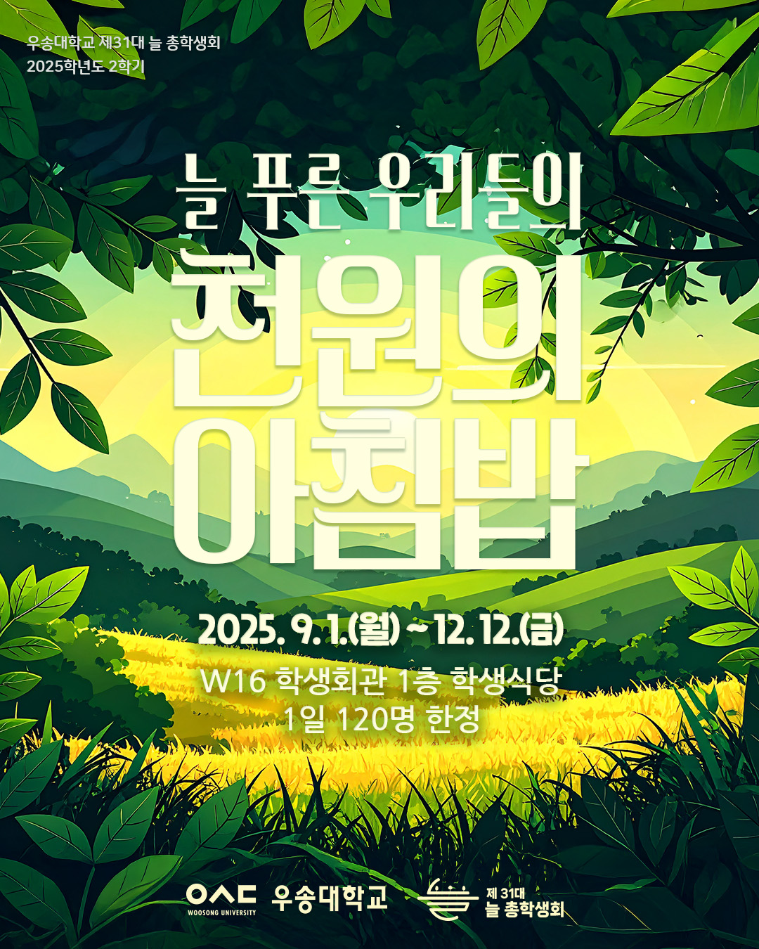 커뮤니티 공지사항 학과뉴스 공모전정보 학과뉴스Home커뮤니티학과뉴스 【학생복지처 학생팀】 2025년도 2학기 천원의 아침밥 운영 안내 작성자 : 학과관리자 | 작성일 : 2025.09.01 | 조회수 : 34 첨부파일 [2]천원의아침밥(2025-2)메인.jpg [2]천원의 아침밥(2025년 9월).png 목록 이전글 【취업지원센터】 2025년 9월호 우송취업 뉴스레터 다음글 【학생상담센터】 9월 홍보포스터