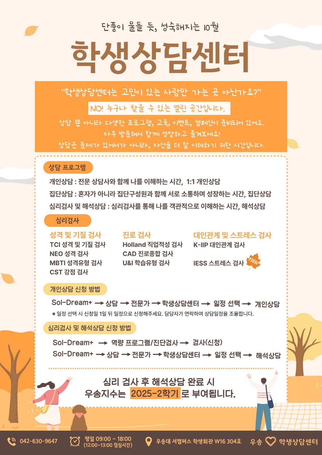 커뮤니티 공지사항 학과뉴스 공모전정보 학과뉴스Home커뮤니티학과뉴스 【학생상담센터】 10월 홍보포스터 작성자 : 학과관리자 | 작성일 : 2025.10.13 | 조회수 : 15 첨부파일 [7]학생상담센터 10월 홍보포스터.jpg 목록 이전글 【취업지원센터】 2025년 10월호 우송취업 뉴스레터 다음글 【취업지원센터】 2025년 9월호 우송취업 뉴스레터
