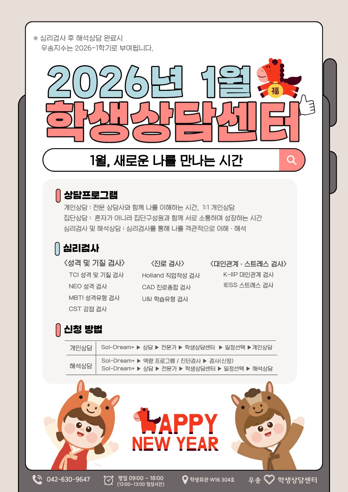 커뮤니티 공지사항 학과뉴스 공모전정보 학과뉴스Home커뮤니티학과뉴스 【학생상담센터】 1월 홍보포스터 작성자 : 학과관리자 | 작성일 : 2026.01.19 | 조회수 : 1 첨부파일 [3]학생상담센터 26년 1월 홍보포스터.jpg 목록 이전글 이전 글이 없습니다. 다음글 【취업지원센터】 2026년 1월호 우송취업 뉴스레터