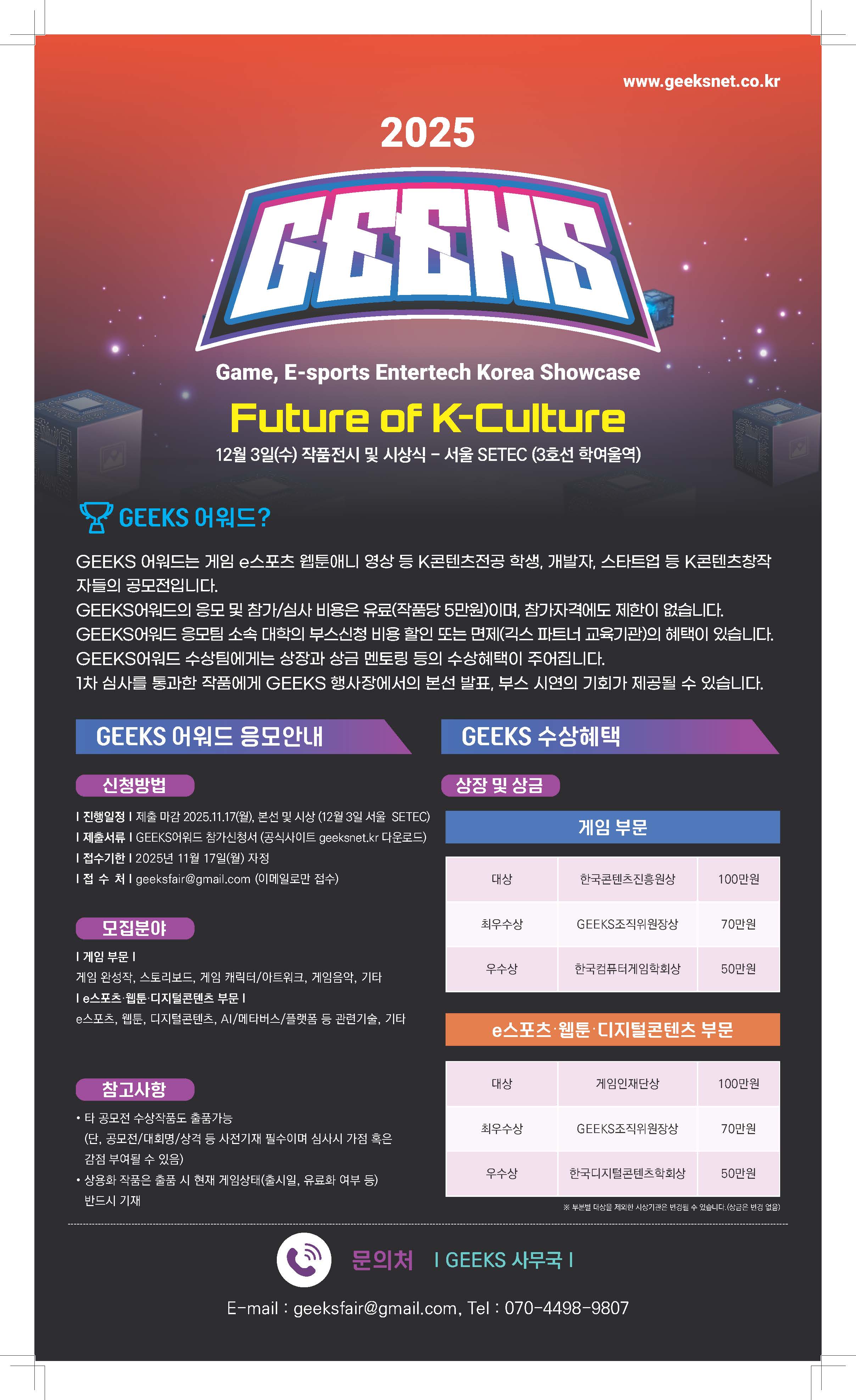 커뮤니티 공지사항 학과뉴스 공모전정보 공모전정보Home커뮤니티공모전정보 GEEKS 2025 어워드 공모전 홍보 안내 작성자 : 학과관리자 | 작성일 : 2025.10.27 | 조회수 : 21 첨부파일 [1]GEEKS 어워드-edm-포스터1-2025.jpg 목록 이전글 이전 글이 없습니다. 다음글 【충북글로벌게임센터】 2025 충청권 인디게임 공모전 '인디유' 홍보 안내
